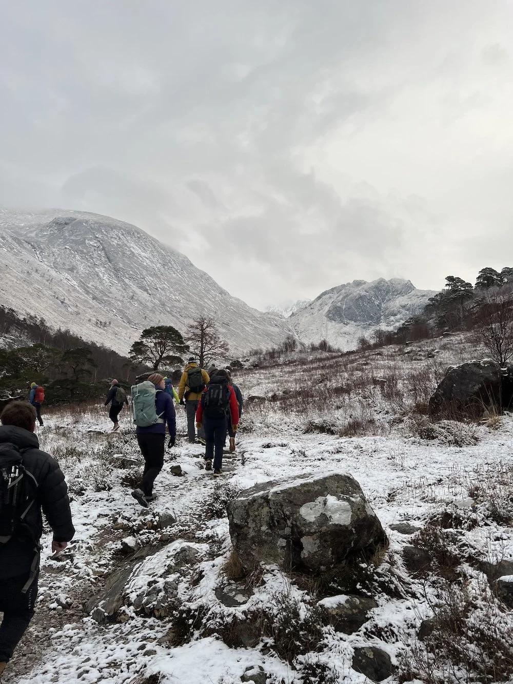 I woke up early Saturday morning to find an unforecasted fall of snow at town level. My initial thoughts were dread as anyone who has driven up Glen Nevis knows the road is quite steep and narrow in places and could prove difficult driving conditions with any snow. I met my workshop group and our mountain leader, Lindsay Warrack at the Nevis Centre carpark at 07:45. Lindsay from Wild Roots Guiding was in charge of our safety for the workshop.